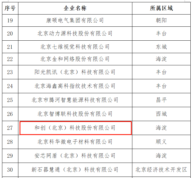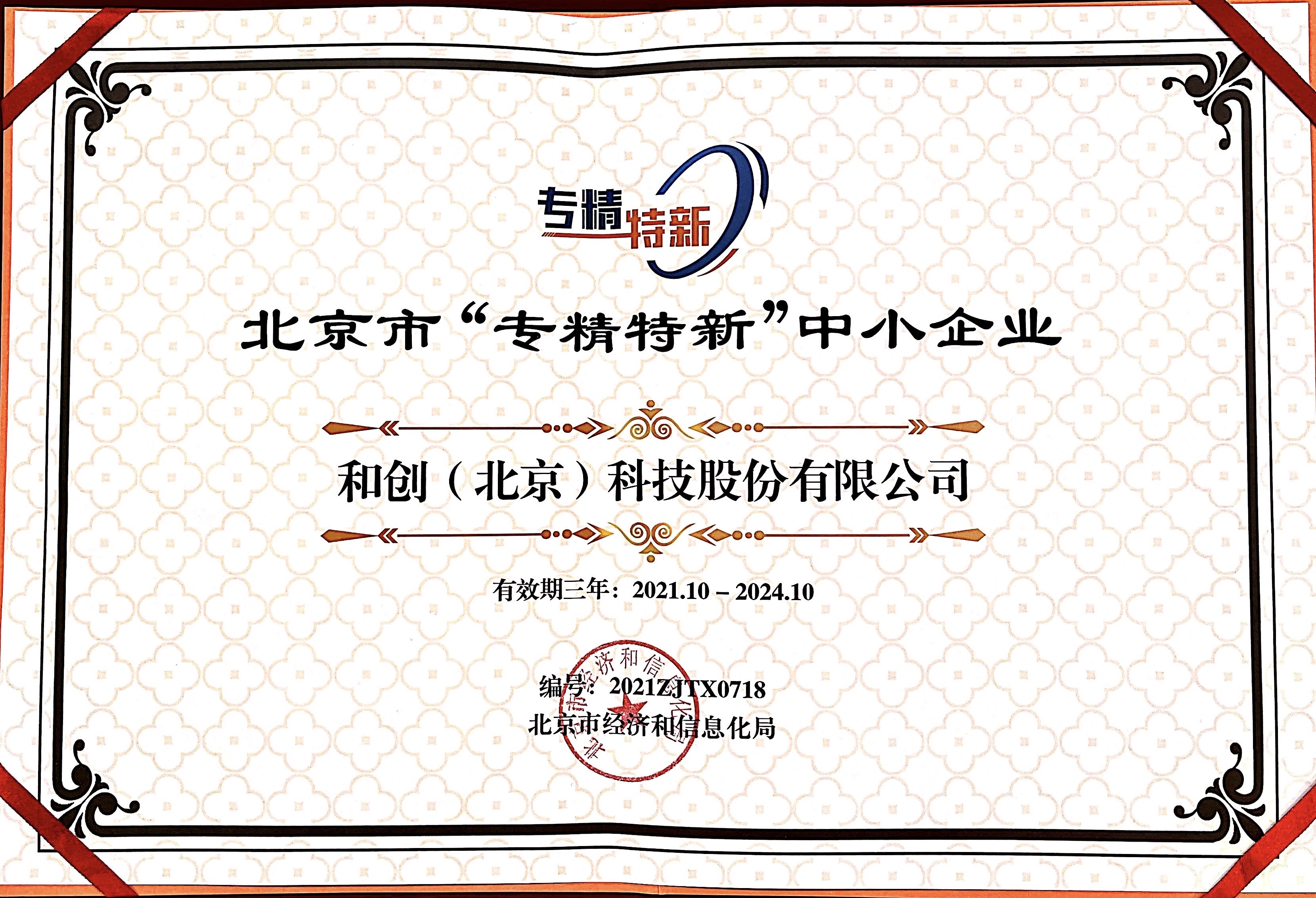 2021 年 10 月 29 日,北京市經(jīng)濟(jì)和信息化局將北京市 2021 年度第六批擬認(rèn)定“專精特新”中小企業(yè)名單予以公示,和創(chuàng)(北京)科技股份有限公司榮登榜單,此次公示期為 10 月 29 日至 11 月 4 日,目前已通過公示期。 根據(jù)北京市經(jīng)濟(jì)和信息化局的評(píng)審程序的有關(guān)規(guī)定,對(duì)于公示期無(wú)異議的,認(rèn)定為“北京市‘專精特新’中小企業(yè)”。