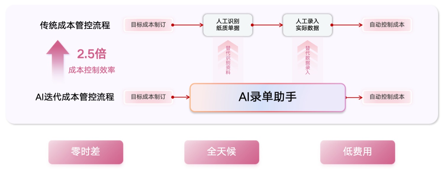 目標成本制訂 → AI錄入助手(替代識別資料、替代數(shù)據錄入) → 自動控制成本