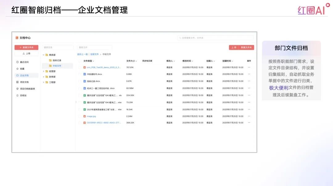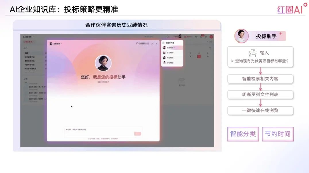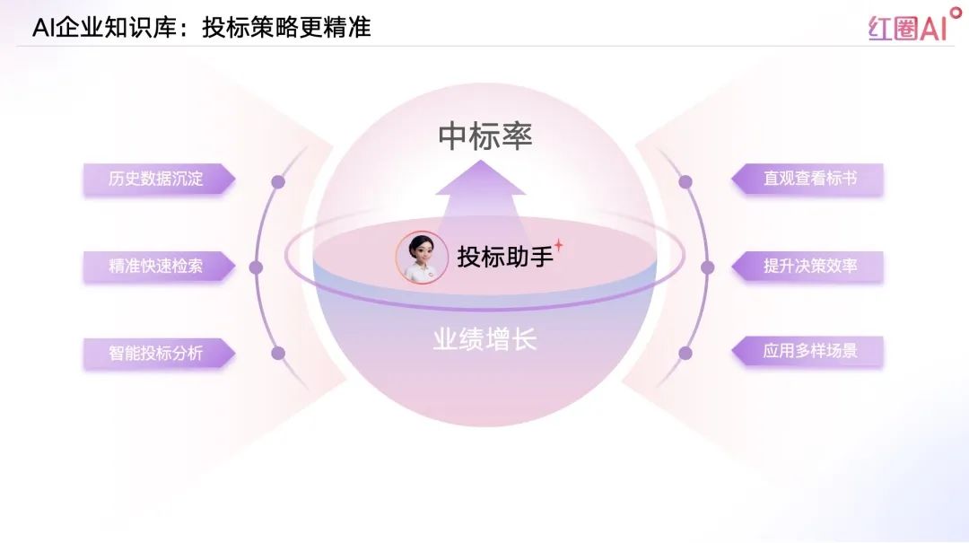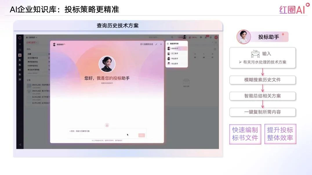 以往投標(biāo)流程中,資料查找和內(nèi)容比對(duì)耗時(shí)耗力、風(fēng)險(xiǎn)頻發(fā)。紅圈AI通過(guò)快速檢索歷史標(biāo)書(shū)、技術(shù)方案、成功案例等內(nèi)容,助力企業(yè)建立專屬“投標(biāo)智庫(kù)”,讓策略制定更具數(shù)據(jù)支撐。