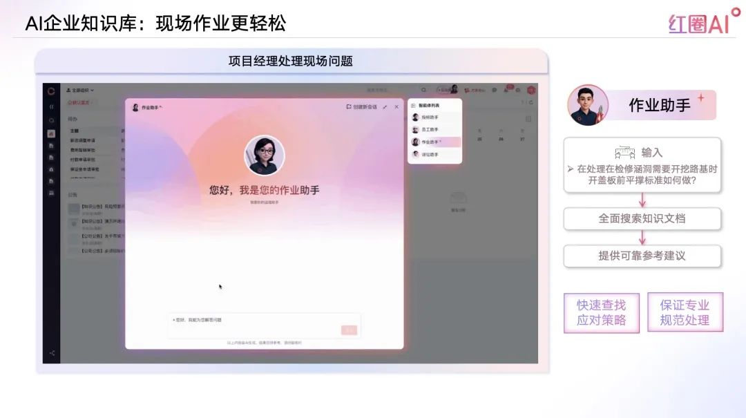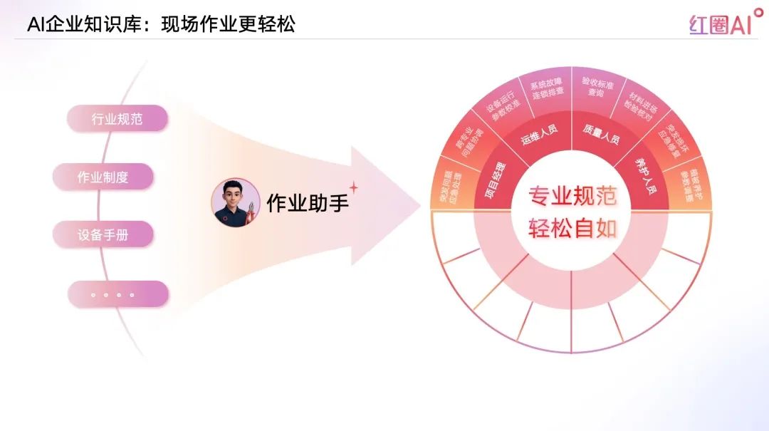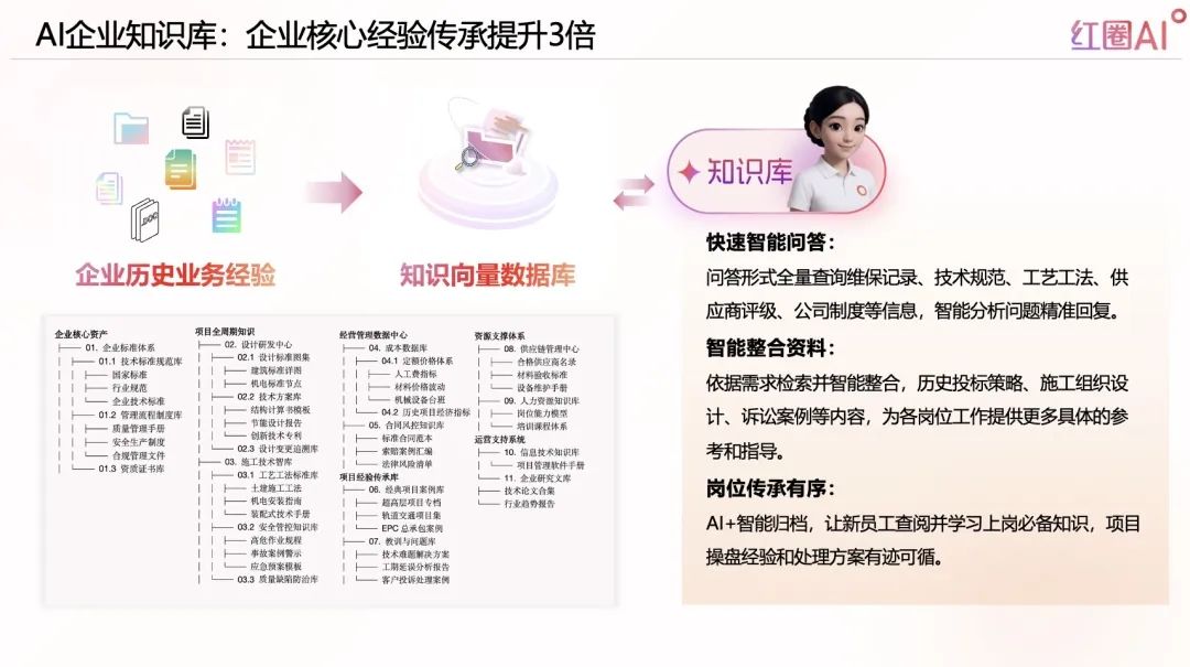 紅圈AI,以大模型+智能檢索技術(shù)為引擎,構(gòu)建企業(yè)知識(shí)資產(chǎn)體系,實(shí)現(xiàn)“經(jīng)驗(yàn)即問(wèn)即答”,推動(dòng)企業(yè)從“人找知識(shí)”走向“知識(shí)找人”。