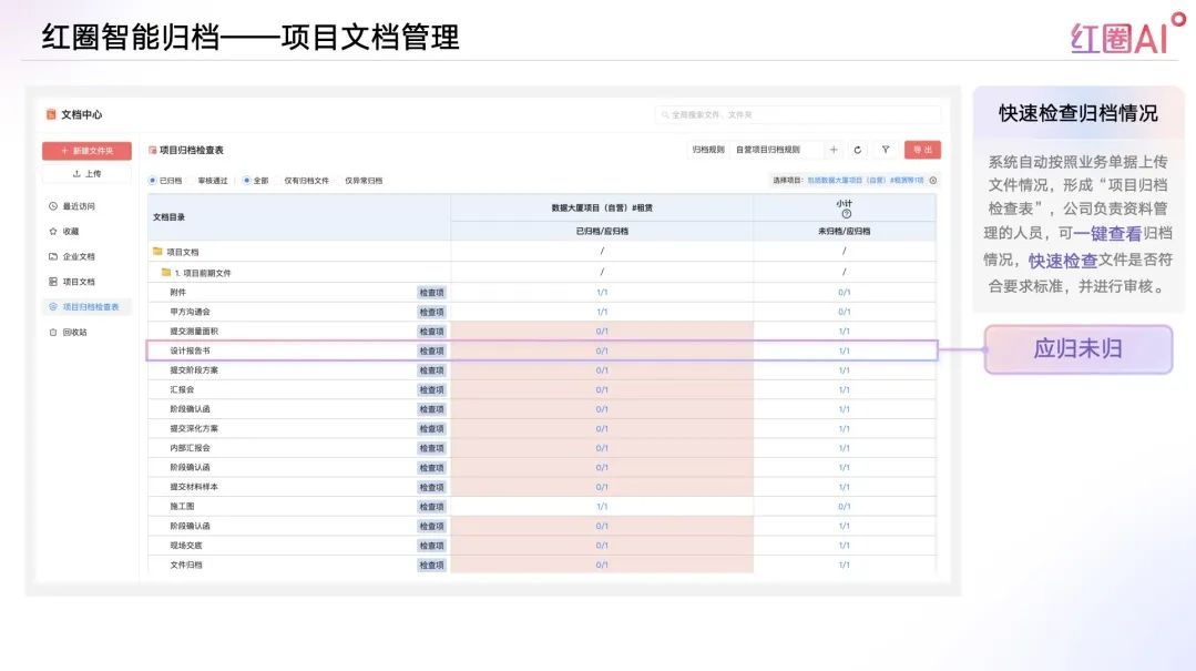 系統(tǒng)自動(dòng)按照業(yè)務(wù)單據(jù)上傳文件情況,形成“項(xiàng)目歸檔檢查表”,公司負(fù)責(zé)資料管理的人員,可一鍵查看歸檔情況,包括“應(yīng)歸未歸”、“應(yīng)歸已歸”、“已歸未審核通過(guò)”等。