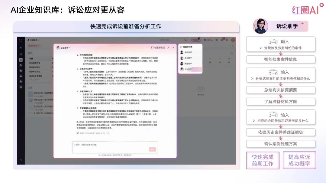 面對(duì)工程糾紛突發(fā)性強(qiáng)、資料復(fù)雜的挑戰(zhàn),紅圈AI構(gòu)建訴訟智庫(kù),協(xié)助法務(wù)快速調(diào)閱判例、合同、律師函、內(nèi)部分析等核心資料,高效支撐應(yīng)訴與風(fēng)險(xiǎn)防控。