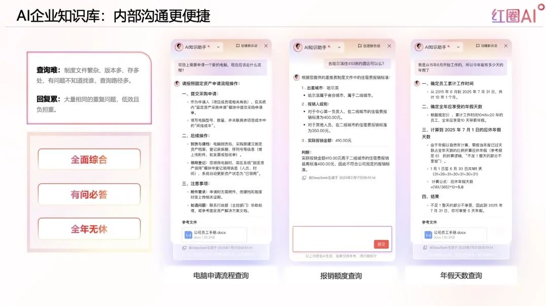 員工常見(jiàn)問(wèn)題如流程、制度、額度等,在傳統(tǒng)體系下查詢不便、響應(yīng)緩慢。紅圈AI通過(guò)自然語(yǔ)言對(duì)話,打造全天候問(wèn)答系統(tǒng),全面提升辦公效率。