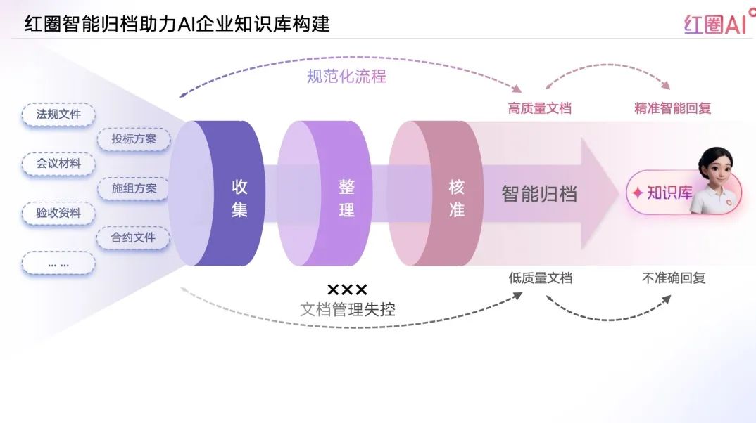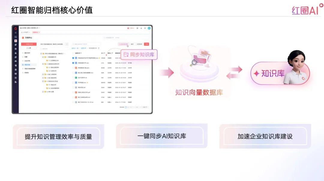 通過(guò)精準(zhǔn)分類、統(tǒng)一歸集、秒級(jí)同步,紅圈AI幫助企業(yè)在最短時(shí)間、最低成本內(nèi)構(gòu)建企業(yè)級(jí)知識(shí)體系,實(shí)現(xiàn)知識(shí)管理智能化、資產(chǎn)化、標(biāo)準(zhǔn)化。