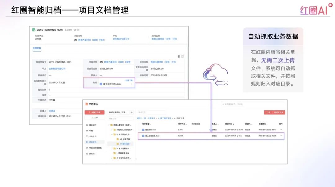 在紅圈內(nèi)填寫(xiě)相關(guān)單據(jù),無(wú)需二次上傳文件,系統(tǒng)可自動(dòng)抓取相關(guān)文件,并按照規(guī)則歸入對(duì)應(yīng)目錄;