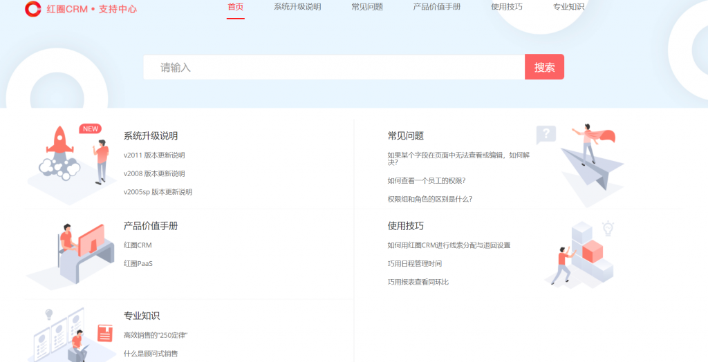 支持中心包含產(chǎn)品價值手冊、版本更新說明、常見問題、常用技巧和專業(yè)知識五部分,用戶可方便查找相關(guān)內(nèi)容。在前臺頁面右上角點擊“支持中心”可直接進入支持中心。