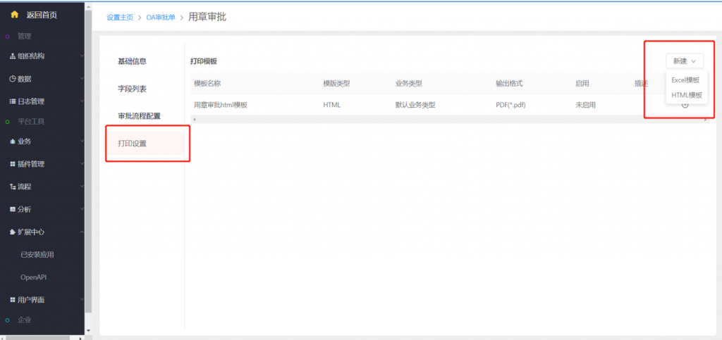 系統(tǒng)設(shè)置—擴展中心—已安裝應(yīng)用—OA審批單—打印設(shè)置,和對象一樣支持excel和html模板