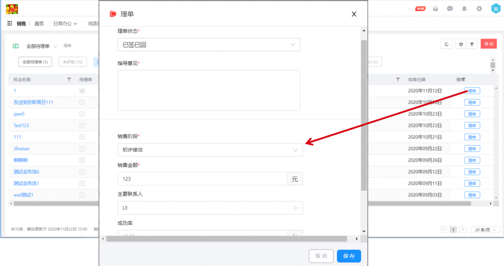 4)理單支持處理人在理單過程中直接修改銷售機會的字段