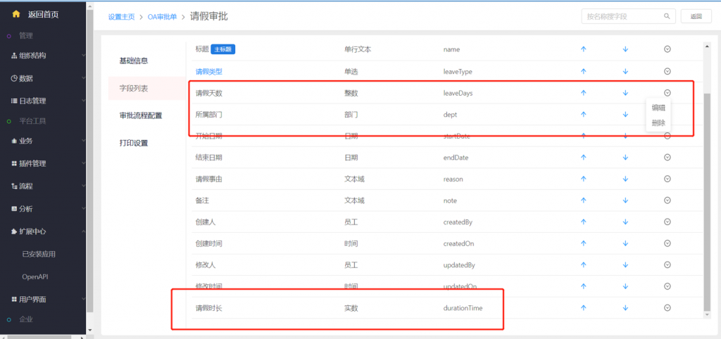 OA審批單—請假審批中默認增加實數(shù)類型的“請假時長”字段;原“請假天數(shù)”改為可刪除
