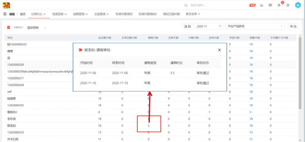 考勤統(tǒng)計中,請假天數(shù)改為請假次數(shù),并支持點擊查看審批單內(nèi)容;