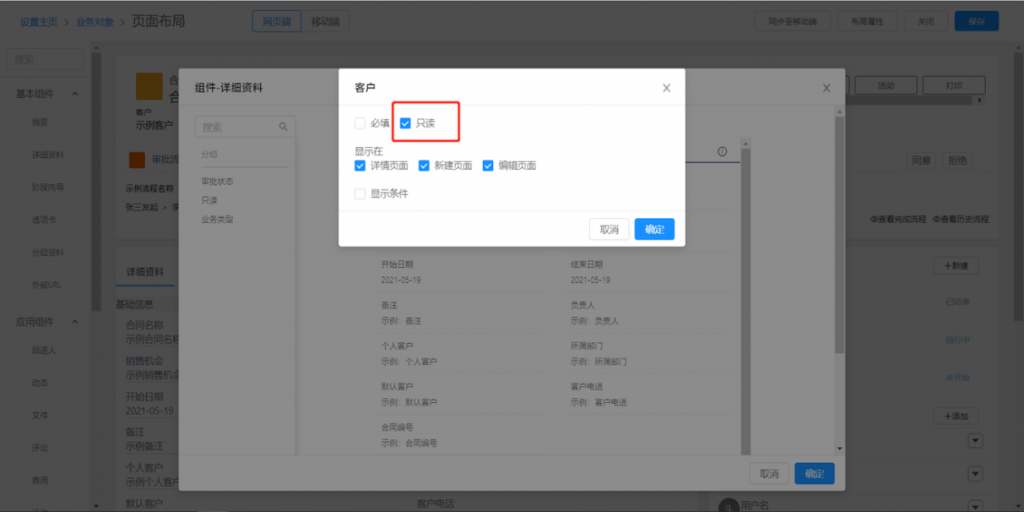 - 頁面布局字段可配置只讀:頁面布局-詳細(xì)資料組件中,字段可配置只讀屬性,在新建或編輯時(shí),字段不可手動(dòng)填寫,但默認(rèn)值可正常計(jì)算