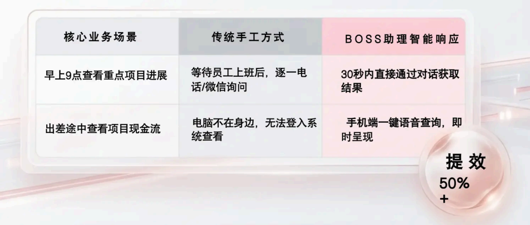 BOSS助理以"智能匯報、精準呈現、數據安全"三大核心優勢為支撐,通過AI意圖深度識別與數據分析模型,實現了數據獲取的革命性突破: