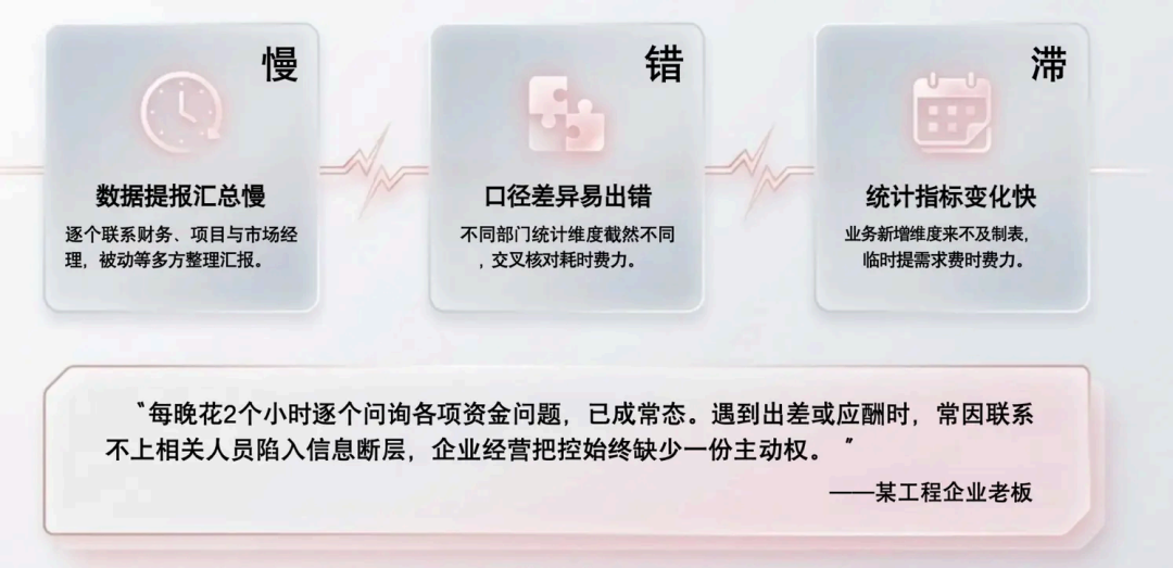 工程企業管理者每天都要面對大量的數據需求:賬戶余額、應收應付、項目進度、市場報備……但在傳統模式下,獲取這些數據卻面臨重重阻礙: