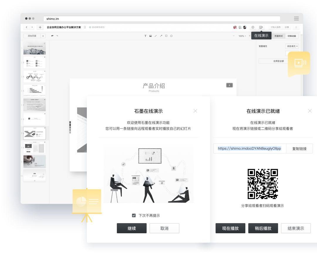 石墨還提供支持多人協(xié)作的幻燈片,團隊成員可通過二維碼、鏈接分享給觀眾,無論身在何方,演示時觀眾只需打開電腦、手機、Pad 等設備就能實時同步播放,即使遠隔萬里也如同在一個會議室面對面交流。