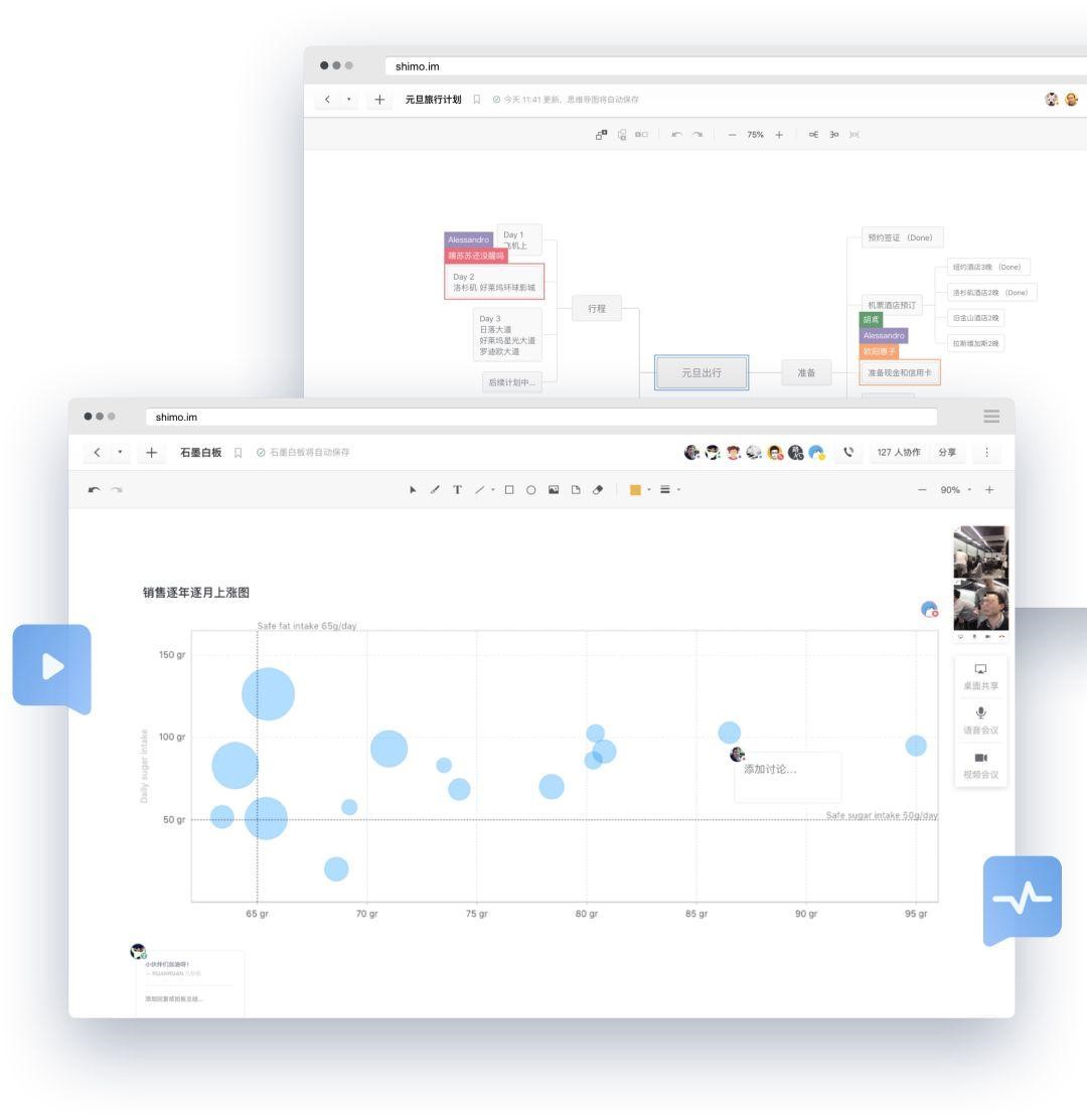 石墨白板讓遠程會議更加高效便捷,多位成員通過音視頻連線,圍繞一個話題各抒己見,邊聊邊寫,邊聊邊畫,討論思路與結(jié)果同步呈現(xiàn)。