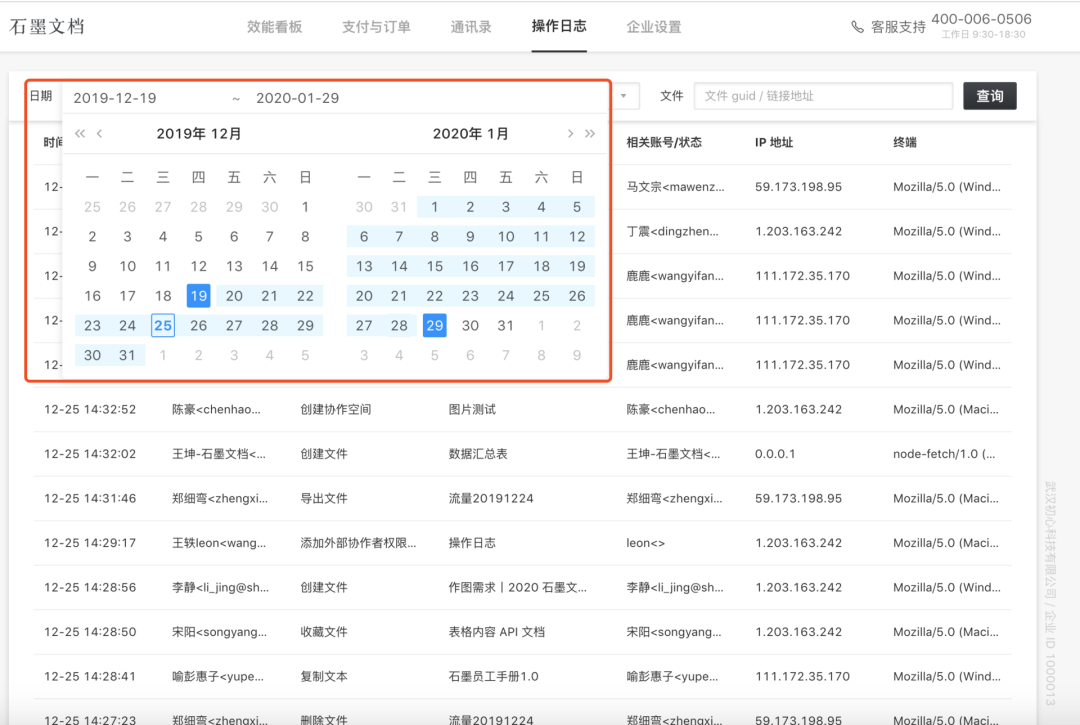 企業(yè)創(chuàng)建者和管理員在后臺可以查詢某一時間段的所有操作日志。