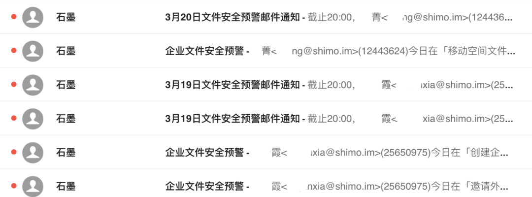 石墨文檔提供的「文件安全預警」功能,可以幫助企業(yè)實時監(jiān)控文件異常狀態(tài),短時間員工大量復制、導出企業(yè)文件等異常操作,企業(yè)會自動收到郵件通知,降低損失。