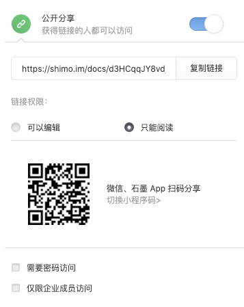 設置文檔公開分享時,可在石墨中設置“需要密碼訪問”或“僅限企業(yè)成員訪問”,從而實現(xiàn)文檔的定點定向傳輸,并可有效杜絕內(nèi)部文檔外泄。