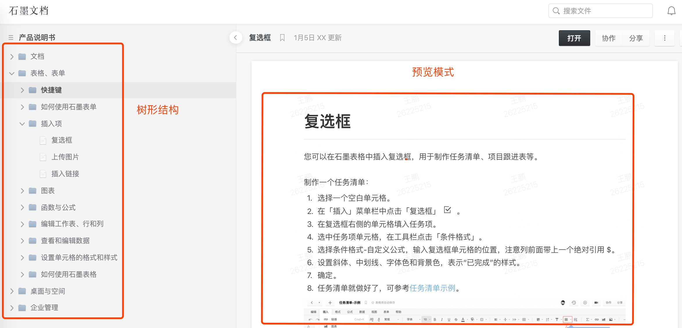 石墨的樹形結(jié)構還提供預覽模式,用戶可直接在左側(cè)的空間目錄點擊文件夾或文件,右側(cè)實時預覽,查看文件內(nèi)容。