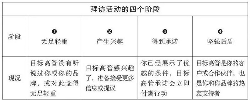 拜訪活動剛開始,你的目標高管要么就是不知道你或你的公司的存在,要么就是隱約地聽說過,但對你或你的品牌毫無印象。他們會覺得你無足輕重,覺得你是陌生人,或者比這個更糟糕——目標高管對你或你的公司抱有負面印象。在這種情況下,外部的措施會對你有幫助,比如在社交媒體上的建樹、寫作和宣傳。這些工作加在一起能幫你改變目標高管對你的負面印象,從而讓你更有可能與他們建立起更有意義的關(guān)系。銷售拜訪的首要功能就是幫你打通這個拜訪階段并走向下一步。