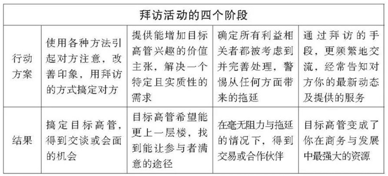 一次拜訪活動結(jié)束后,它的回應(yīng)率、投資回報率、支出和收入數(shù)字,都可以告訴你活動是否成功。不過,據(jù)我發(fā)現(xiàn),在活動進行過程中,歸類分析每一位目標客戶,然后跟蹤他們的變動順序,總是能幫助你取得最好的結(jié)果。這就是下面我們分析“四個拜訪階段”的用意:幫助你為每一次拜訪活動準備一套標準的評估系統(tǒng),因地制宜地實施必要的行動,從而最大限度地提高營銷活動的成功率。
