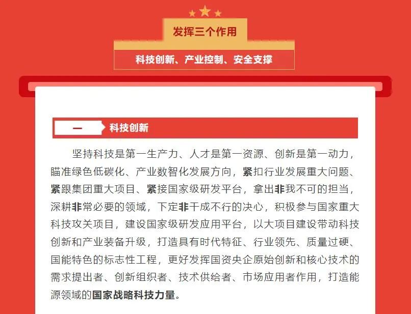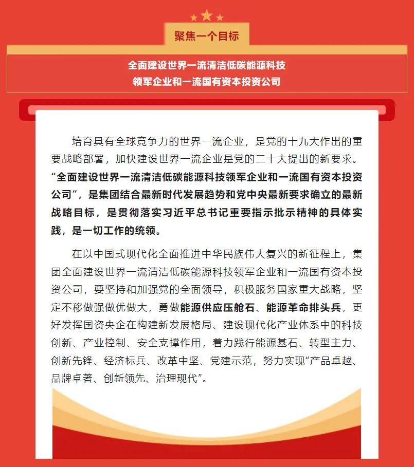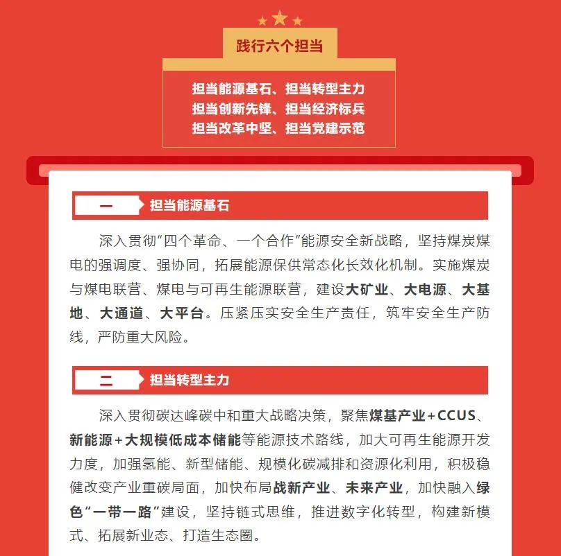 國家能源集團最新確立了“一個目標、三個作用、六個擔當”發(fā)展戰(zhàn)略。一個目標是指“全面建設世界一流清潔低碳能源科技領軍企業(yè)和一流國有資本投資公司”,三個作用是指發(fā)揮科技創(chuàng)新、產(chǎn)業(yè)控制、安全支撐作用,六個擔當是指擔當能源基石、擔當轉型主力、擔當創(chuàng)新先鋒、擔當經(jīng)濟標兵、擔當改革中堅、擔當黨建示范。
