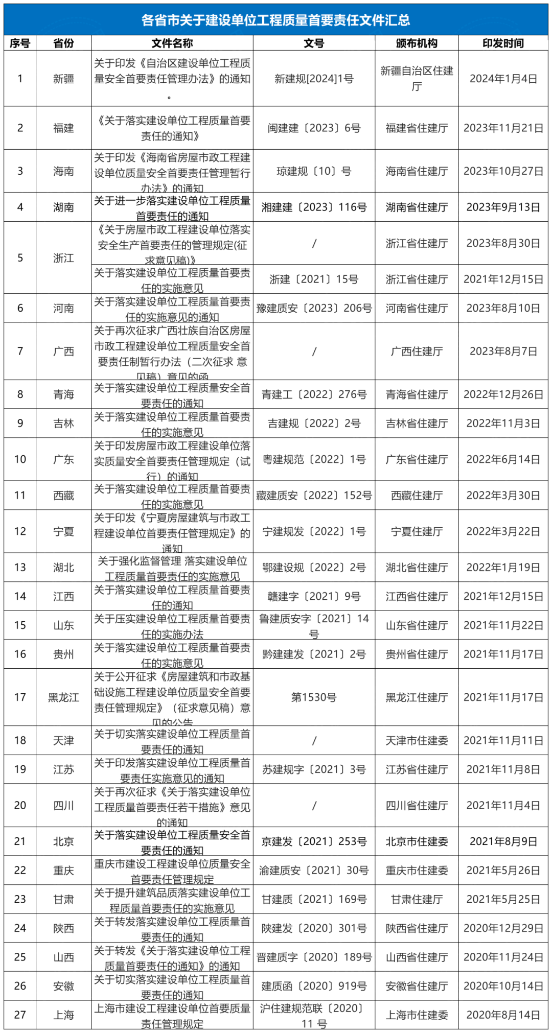 截至目前,27省市已經(jīng)發(fā)文跟進(jìn)住建部《關(guān)于落實(shí)建設(shè)單位工程質(zhì)量首要責(zé)任的通知》(建質(zhì)規(guī)〔2020〕9號),嚴(yán)格落實(shí)建設(shè)單位工程質(zhì)量首要責(zé)任。