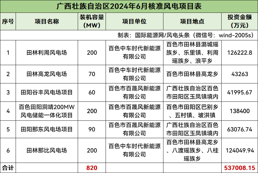 廣西核準(zhǔn)6個風(fēng)電項目,總規(guī)模820MW,總投資537008.15萬元,均為陸上風(fēng)電項目。