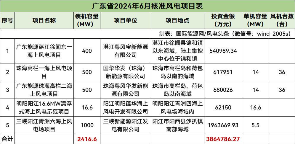 廣東核準(zhǔn)5個風(fēng)電項目,總規(guī)模2416.6MW,總投資3864786.27萬元,均為海上風(fēng)電項目。