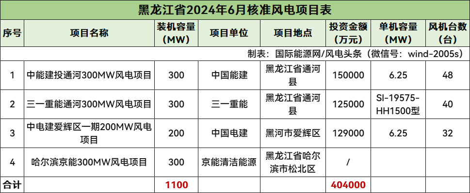 黑龍江核準(zhǔn)4個風(fēng)電項目,總規(guī)模1100MW,總投資404000萬元,均為陸上風(fēng)電項目。