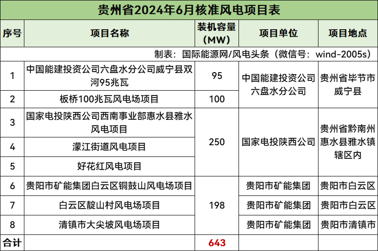 貴州核準(zhǔn)8個風(fēng)電項目,總規(guī)模643MW,均為陸上風(fēng)電項目。