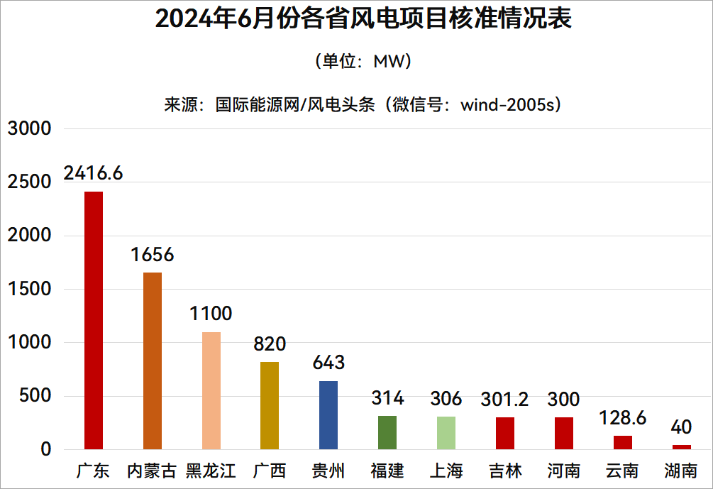 2024年6月風(fēng)電項目獲核準(zhǔn)的省份分別是廣東、內(nèi)蒙古、黑龍江、廣西、貴州、福建、上海、吉林、河南、云南、湖南等11個省份。