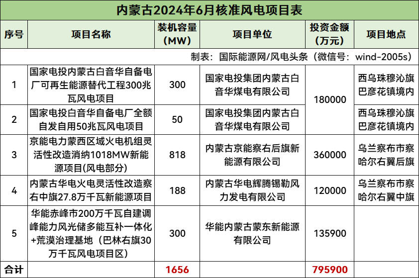 內(nèi)蒙古核準(zhǔn)5個風(fēng)電項目,總規(guī)模1656MW,總投資795900萬元,均為陸上風(fēng)電項目。