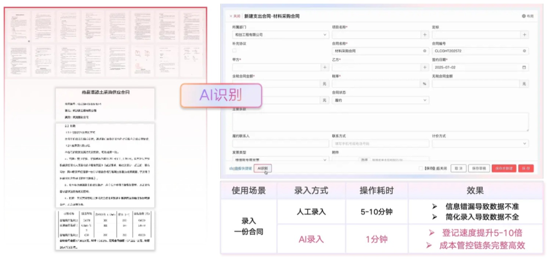 大量手寫(xiě)確認(rèn)單、混凝土票據(jù)、支出合同、機(jī)打送貨單和辦公登記表的錄入任務(wù),不管是在出差途中或辦公場(chǎng)景中,員工只需將紙質(zhì)單據(jù)拍照上傳,即可實(shí)現(xiàn)一鍵識(shí)別與系統(tǒng)自動(dòng)錄入,徹底擺脫繁瑣工作、減少重復(fù)勞動(dòng)。