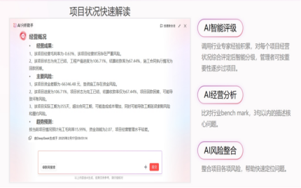 而紅圈AI的加入,則將這種可視化升級為“可解讀”、“可對話”的智能洞察。 想象一下,你不再需要費(fèi)力地閱讀圖表,而是可以直接向你的“BOSS 助理Agent”提問:“小王,這個月公司現(xiàn)金流怎么樣?哪個項(xiàng)目成本超支最嚴(yán)重?”。這位BOSS 助理Agent能借助大模型的推理能力,精準(zhǔn)挖掘企業(yè)自有數(shù)據(jù)模型,用自然語言向你匯報(bào)全面、準(zhǔn)確的經(jīng)營數(shù)據(jù),甚至能主動指出異常和風(fēng)險(xiǎn)點(diǎn),讓洞悉經(jīng)營狀況變得像聊天一樣簡單。更進(jìn)一步。紅圈AI的“項(xiàng)目360°AI解讀”,能整合資金、成本、合同、付款等全維經(jīng)營指標(biāo),一鍵生成項(xiàng)目的全景“作戰(zhàn)圖”。 不再只是展示數(shù)據(jù),更能通過大模型深度解讀數(shù)據(jù)背后的經(jīng)營風(fēng)險(xiǎn)與應(yīng)對策略,將復(fù)雜的專業(yè)數(shù)據(jù)轉(zhuǎn)化為管理者一眼就能看懂的決策語言,真正讓管理全局盡在掌握。這能幫助解決傳統(tǒng)經(jīng)營會議中因會前準(zhǔn)備不足、數(shù)據(jù)錯漏導(dǎo)致的效率低下問題。