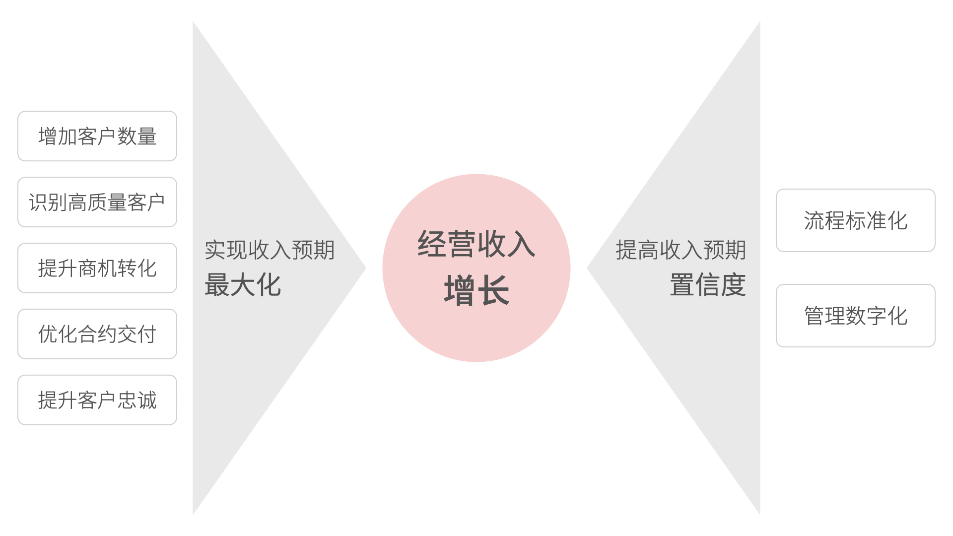 為了實現(xiàn)企業(yè)經(jīng)營收入增長這個核心目標,CRM 軟件需要企業(yè)實現(xiàn)收入預期最大化和提高收入預期置信度。實現(xiàn)收入預期最大化這個目標可以從五個方面入手:增加客戶數(shù)量、識別高質(zhì)量客戶、提升商機轉(zhuǎn)化、優(yōu)化合約交付、提升客戶忠誠。而提高收入預期置信度的本質(zhì)是降低業(yè)務戰(zhàn)略執(zhí)行的不確定因素,從人治模式轉(zhuǎn)型為系統(tǒng)管理,即流程標準化和管理數(shù)字化。