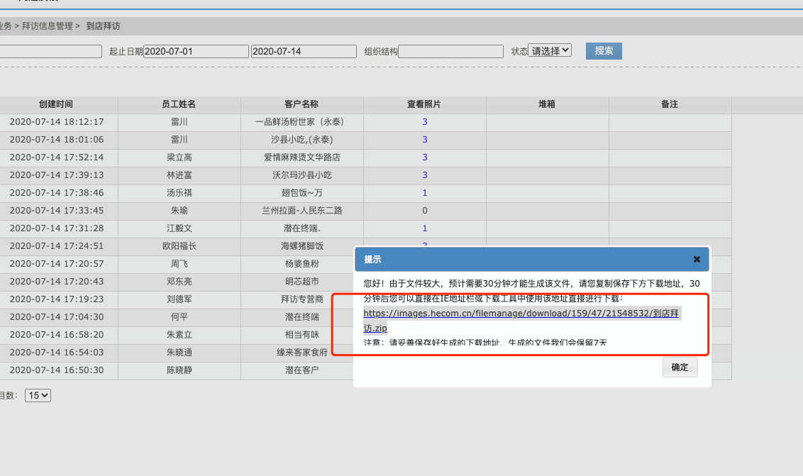 帶圖片數(shù)據可能會比較大,中等企業(yè)(500人以下)一個月驗證生成壓縮包文件大小有幾百M左右(主要是圖片太多占用空間),點擊導出以后記錄生成的下載鏈接一般15分鐘左右后可以開始下載,如果下載不成功說明文件還沒有生成完(數(shù)據庫查詢完數(shù)據再寫入Excel文件,包括寫入圖片,會比較耗時)。